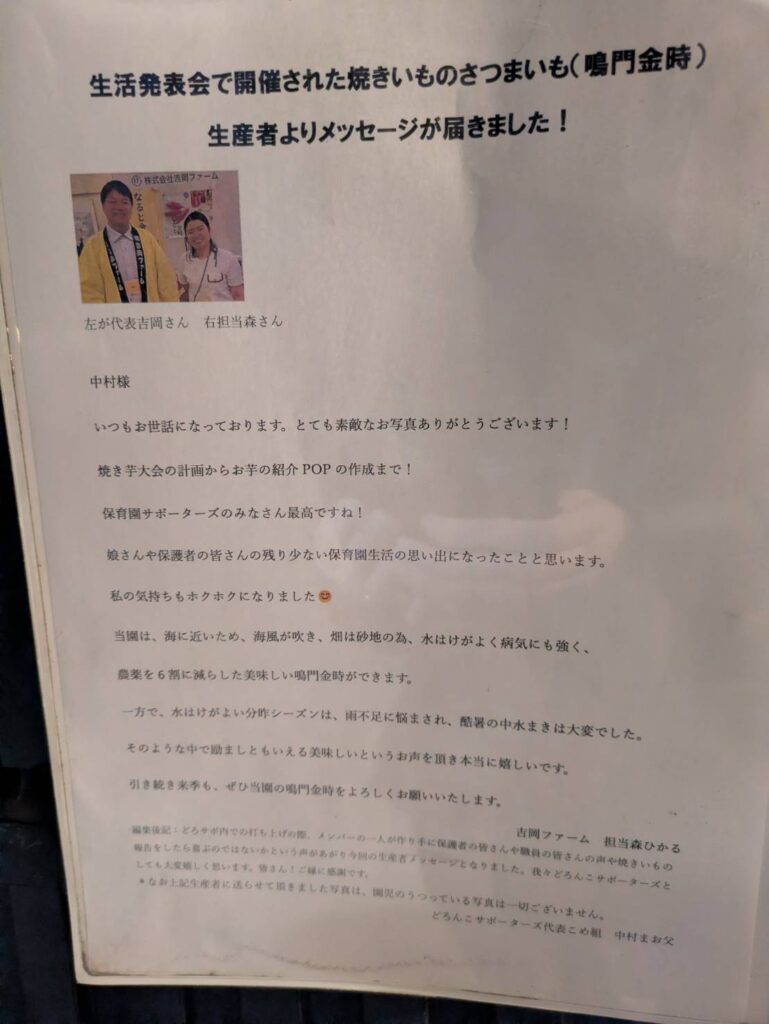 心のこもったメッセージが届き、保護者・職員の皆さん・準備をしたサポーターズの皆さんに共有、園に掲示して頂くことになりました。